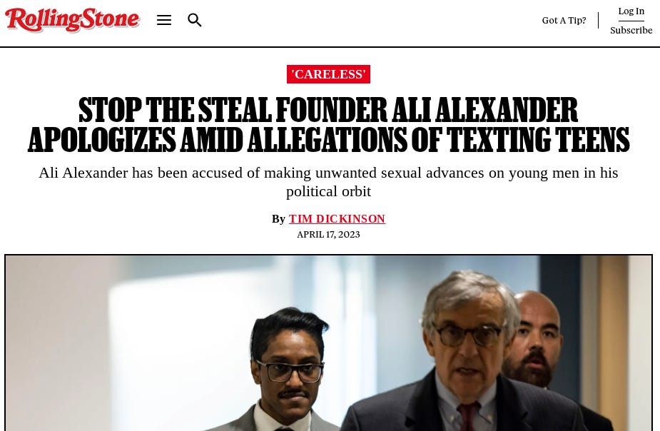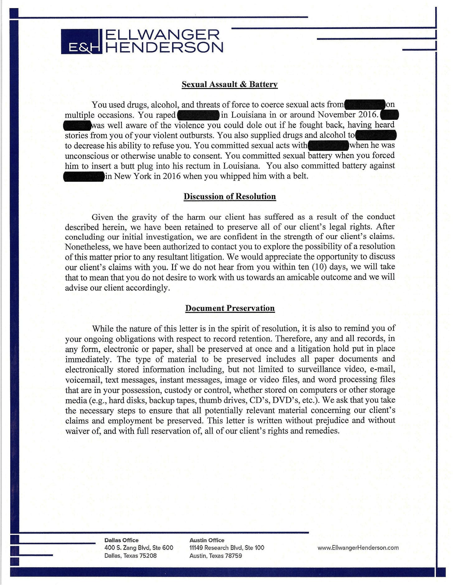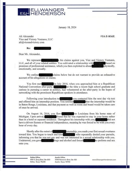 I contacted the law firm that sent this legal letter, which connected me directly with “Joe.” He told me that after sending his letter, Ali Alexander’s attorneys proposed a settlement so insultingly low that he rejected it, and reported the alleged crime to the Baton Rouge Special Victims Unit. The statute of limitations, both civil and criminal, remains open for many of these claims.