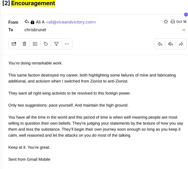 In 2010, Ali’s mother registered a political consultancy called Vice and Victory Agency, which received more than $40,000 from a tea party PAC that Politico later dubbed a “scam PAC.” As I was drafting this article, Ali unexpectedly emailed me from a “Vice and Victory” email handle, spinning this narrative that people came after him because stood up to Jews, not because of the pedophile stuff.