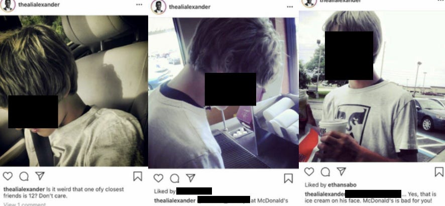 Ali Alexander, born in 1984, was 29 in 2013 when he befriended “Matthew,” a 12-year-old boy he met online, photographing the boy with captions like “is it weird that one of my closest friends is 12? Don’t care” and another joking about “ice cream” (implying jizz) on his face. Ali called Matthew “my best friend,” “muscle jock,” and “fatty jock,” then talked about flying him out for New Year’s Eve.