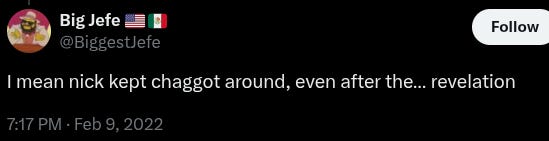In 2022 Nick admitted that he ‘‘still talks with Ali every day,’’ and in 2023 was still actively re-posting and boosting him.