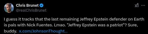 “The second I put out the statement condemning Ali Alexander, Nick called my phone in about five minutes. He hadn’t called me for years. Oh, but now you’re going to call me? Now you’re going to call me when I’m condemning the pedophile? Huh? So I put out the statement saying, ‘Ali Alexander is a pedophile. I will not be working with him moving forward.’ Instantly, ding, ding, ding, Nick’s calling my phone. He never calls me. And he starts running damage control. ‘Hey, what are you doing, big guy? OK, you know, trying to get me to placate.’ I’m like, ‘Bro, hey, you know, no offense to you, this shit is—this shit made me sick, and the fact that Nick went out there and was like, “I’m the real victim here.’’ It makes me sick.’’
