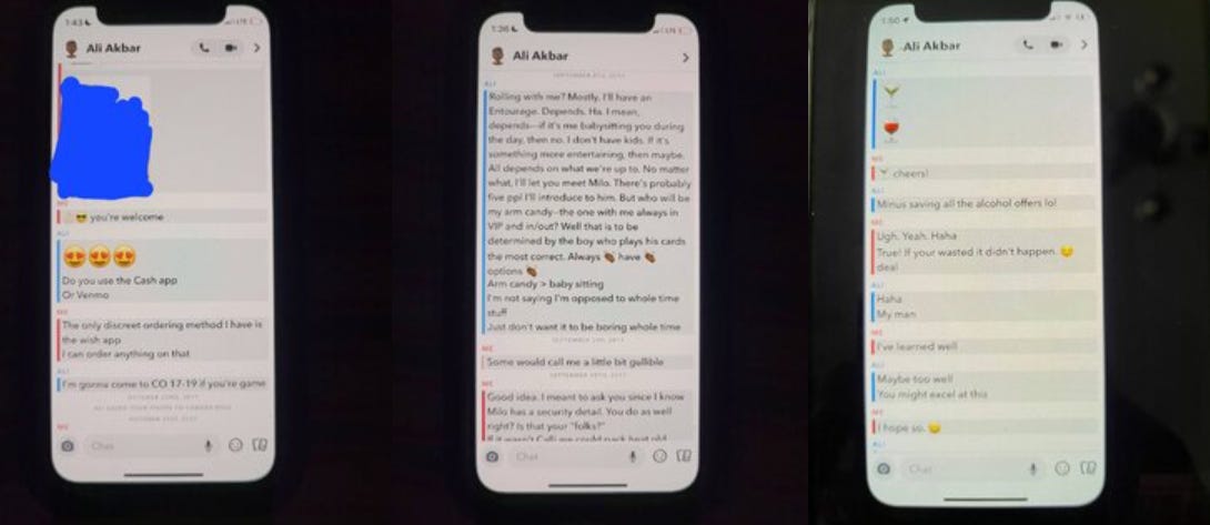 Conversation records show Akbar calling [the target] his “puppy.” He asks repeatedly when they might meet in person for sex. He also dangled career opportunities and introductions, none of which ever materialized.