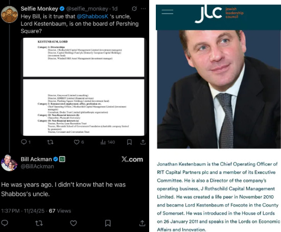 His uncle, Rothschild-connected Lord Jonathan Kestenbaum, served on the board of Bill Ackman’s Pershing Square.