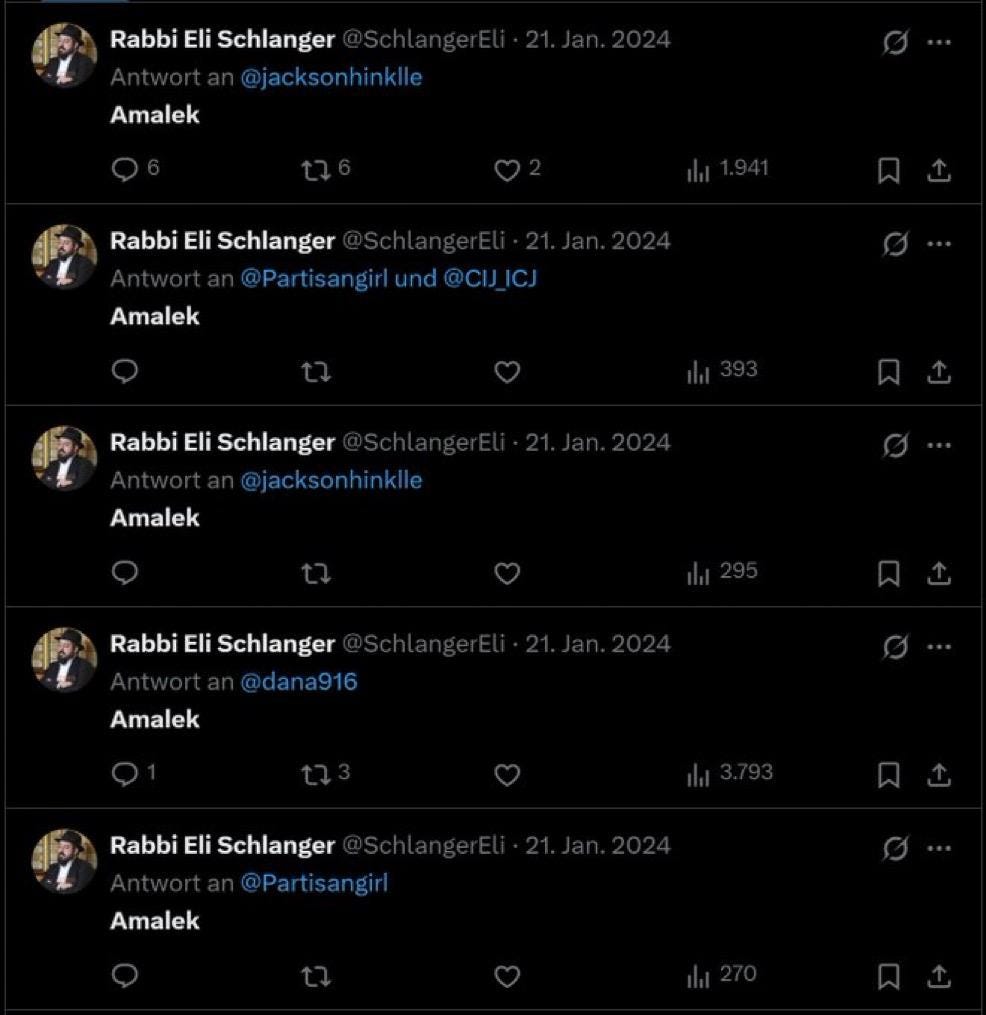 Rabbi Eli Schlanger, who died last month in the Bondi Beach shooting, has a, extensivey documented history of justifying war crimes by labeling dead Gazan children and anti-Zionist political commentator alike as “Amalek.”