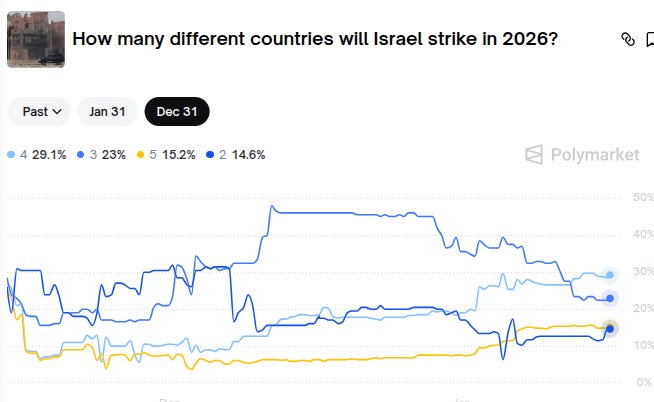 In 2025, Israel attacked at least six countries: Palestine, Iran, Lebanon, Qatar, Syria, and Yemen. How many will they attack in 2026, using American tax dollars? Polymarket is currently predicting they will attack four.