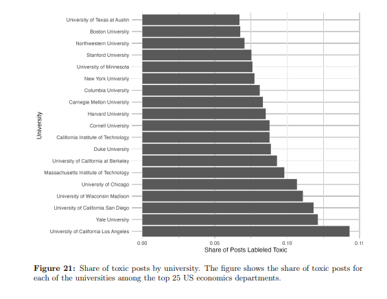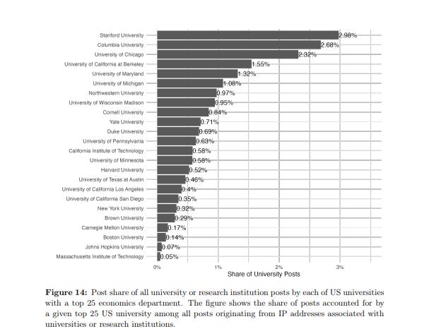 The paper does some cute NLP stuff, like, determine that Stanford and Columbia and Chicago are the most active departments on EJMR.