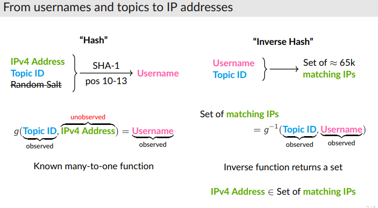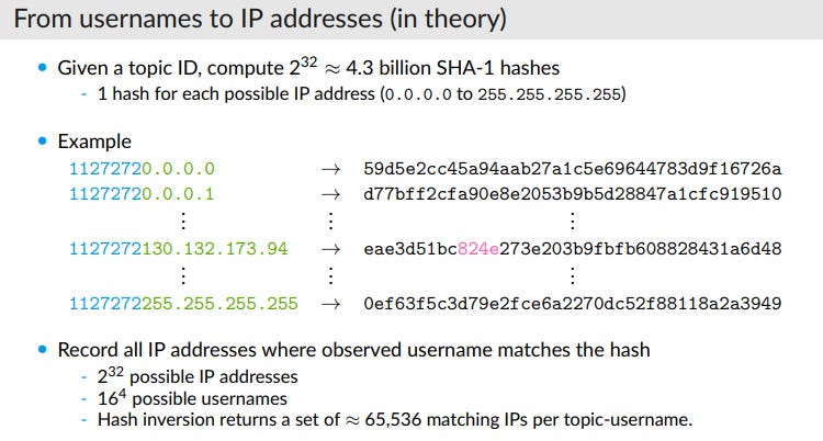 To recover IP addresses from the observed usernames on EJMR, we employ a multi-step procedure. First, we develop GPU-based software to quickly compute the SHA-1 hashes used for the username allocation algorithm on EJMR. In total, we compute almost 9 quadrillion hashes to fully enumerate all possible IP combinations and to check which of the resulting substrings of hashes match the observed usernames. For each post, this roughly narrows the set of possible IP addresses from 2 32 to 2 16. Second, we measure which IP addresses occur particularly often in a narrow time window and use the uniformity property of the SHA-1 hash to test whether these IP addresses appear more often than would likely occur by chance.