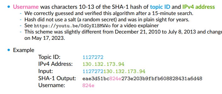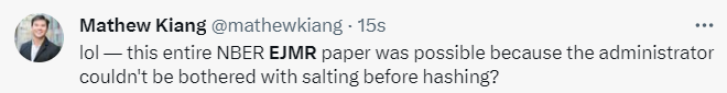 I am not going to pretend like I know the math, but I do know basic cybersecurity, and it seems like the big mistake that the site owner made was a pretty rookie cybersecurity mistake: he didn’t salt his hashes until... May 17, 2023, a few days after Florian announced the abstract.