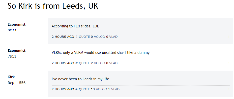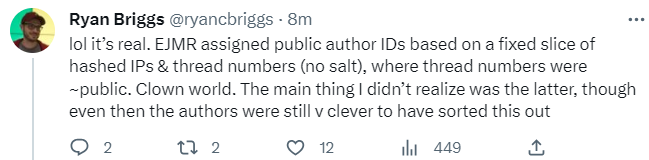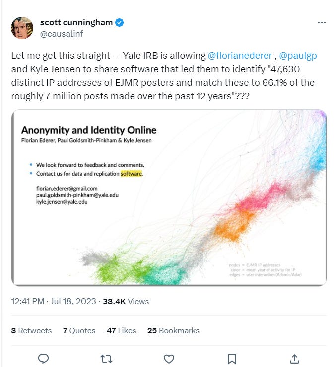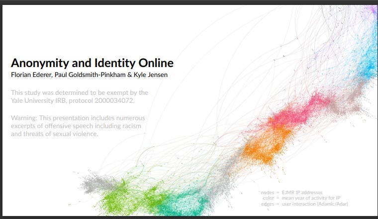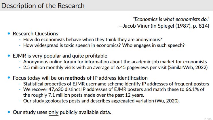 I skimmed the paper and the slides. There is no contribution to economics in the paper, but the effect on past EJMR posters will be huge. They describe the hashing (and “unhashing”) procedure. Anyone who posted in two or more threads from the same IP is screwed.
