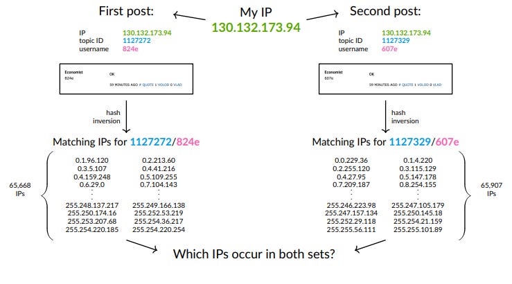 Ederer's approach is fundamentally flawed Assume that you have ten posts in ten threads such that there is only one possible IP that matches all of them. This exists for sure. But we don't know in advance that these ten posts are linked together.